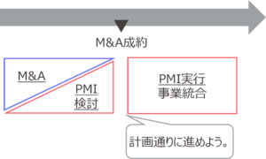 PMIはM&Aの後に始まるプロセス、M&Aとは別物のプロセス、とみられることがあります。そのように捉えた場合、M&A直後にいきなりPMIの課題に直面してドタバタが生じます。ドタバタだけなら良いですが、M&Aの意味がなかったとなれば最悪の事態です。