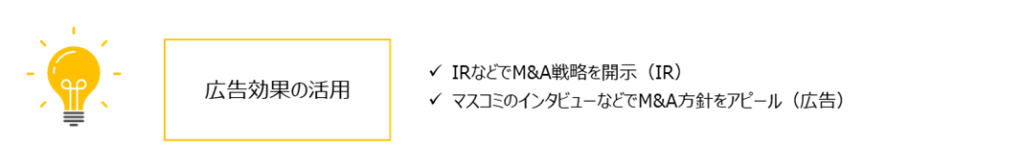 IRでの経営方針説明やマスコミのインタビューなどを通してM&A方針をアピールする方法です。