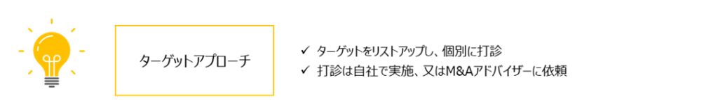 買収候補先に買い手自身又はM&Aアドバイザーが直接打診し、M&A協議を提案する方法です。