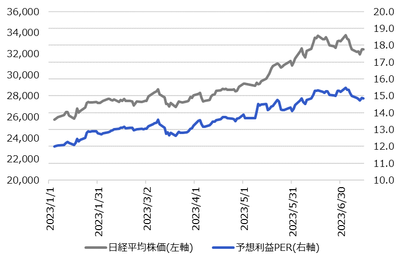 日経平均株価を構成する企業の直近の平均PER(※1)は14.9倍です。近年、株価は上昇傾向であり、PERも上昇傾向にあります。