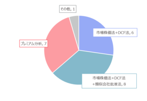 市場株価法は客観性が高く説明力に優れるため、上場会社の株式評価において一般的に使用されます。DCF法はM&Aにおける主流の手法であり、企業の将来収益を考慮した評価ができるため多くのケースで採用されます。今回の調査範囲では基本的に市場株価法とDCF法が採用されています。