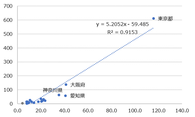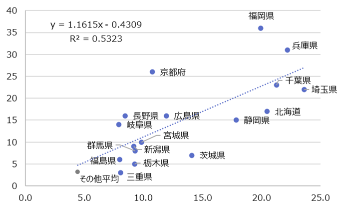 中小規模のM&Aも含めた網羅的なM&A件数ではありませんが、経済規模とM&A件数は概ね連動しています。点線より上に位置する県が経済規模対比でM&A件数が多めの県ということになります。