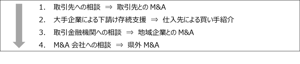 考えようによっては、相手先を絞ることで選択肢を狭めているとも言えます。取引金融機関から地域企業への備忘価格での売却を勧められた企業が憤慨し、努力と工夫をして県外企業に適正価格で売却したような事例も有ります。