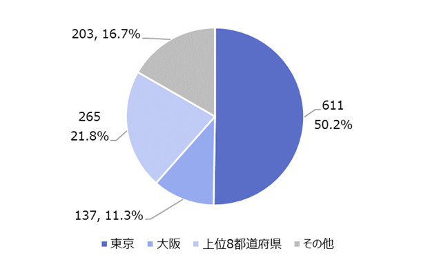 日本のM&Aは大都市圏が中心となっており、特に東京や大阪で活発です。以下の円グラフの通り、日本のM&Aの過半は東京又は大阪でなされています。