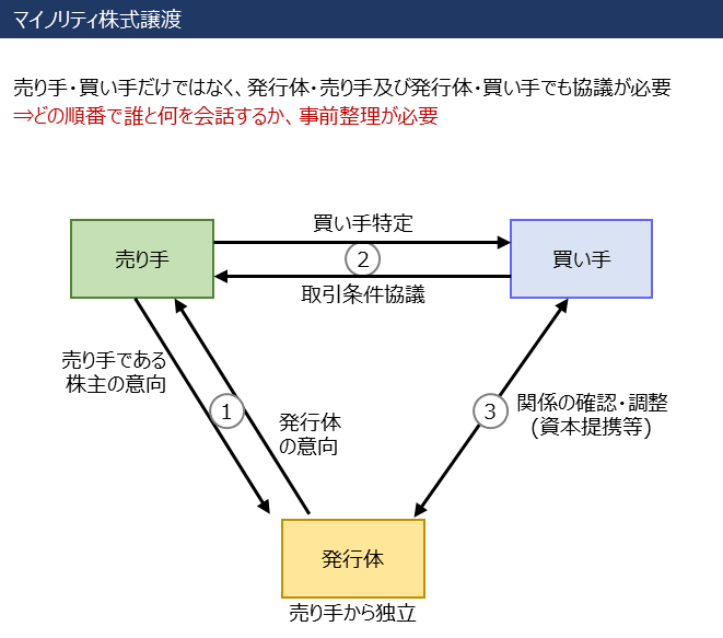 また、マイノリティ株式に何らかの換金価値(及び換金の実現可能性)があるとしても、マイノリティ株主単独では経営関与ができず、発行体の経営判断に振り回されるリスクがあります。そのため、買い手と発行体との間に事前のコミュニケーションが必要となります。