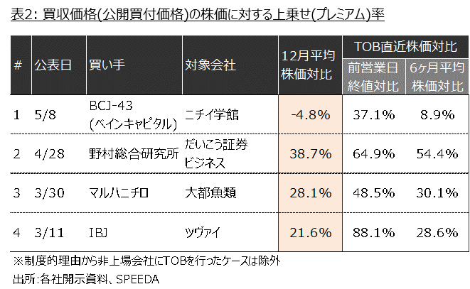4件のうち3件では買収価格は昨年12月の平均株価対比で+20%~40%であり、買収価格が大幅に下がったようには見受けられません。