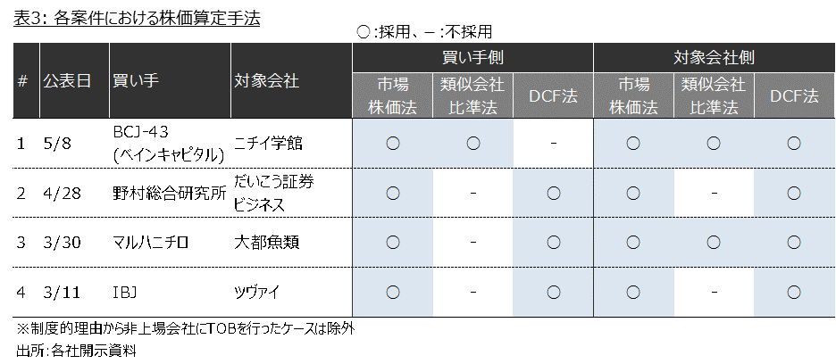 新型コロナ下においてどのような方法で適正な企業価値を検討しているのでしょうか。各社の株価算定方法は表3の通りです。