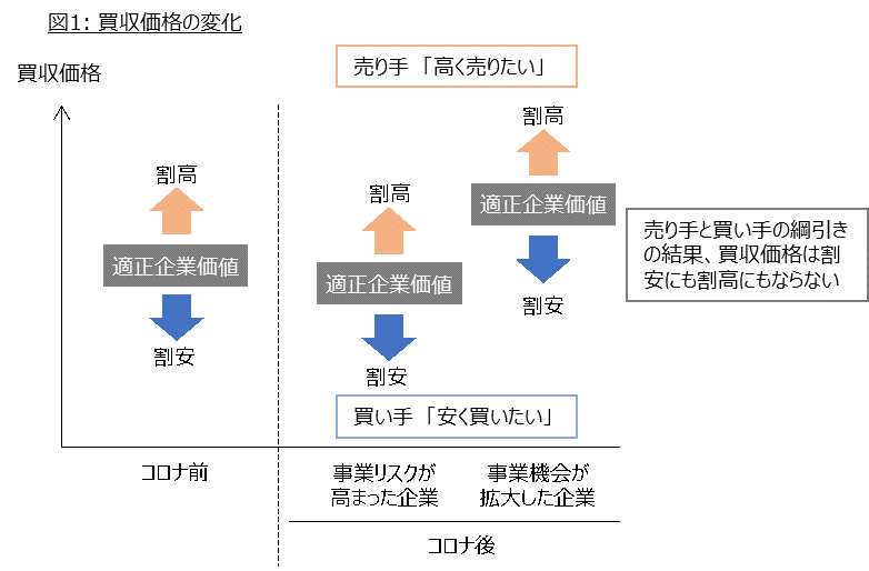 新型コロナにより事業リスクが高まった企業の価値は低下し、事業機会が拡大した企業の価値は増加します。結果として買い手の期待と売り手の期待の均衡点・買収価格も変化します。