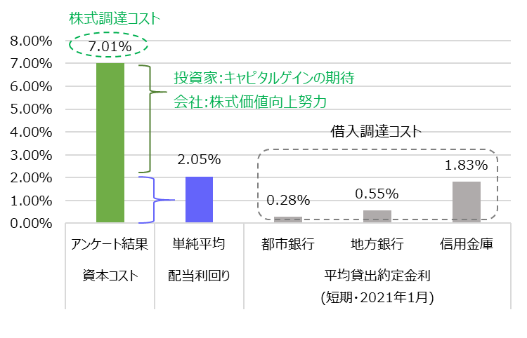 企業金融の世界ではそのようには考えられていません。株式投資の見合いとしてどの程度のリターンを期待するか、投資家側の期待リターンを考える必要が有ります。日本の金融機関・上場会社・プロフェッショナルファームに対するアンケート調査(※1)によると期待リターンは概ね年率7%と考えられているようです。
