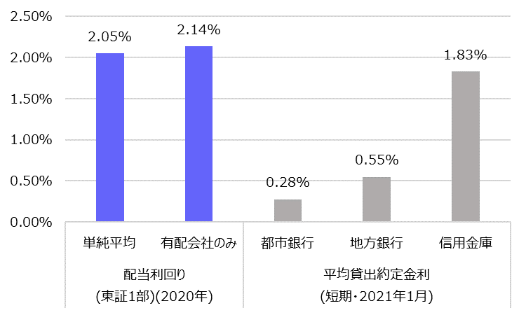 株式と対をなす借入金の費用も見てみます。金融機関の貸出金利が参考となりますが、借入金利の水準は0.3~1.8%(メガバンクや信用金庫)です。ゼロ金利というやや特殊な金利環境です。