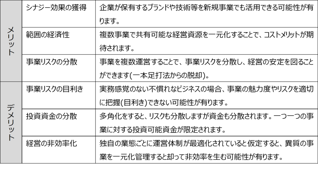 多角化戦略には一般に次のようなメリット・デメリットがあります。