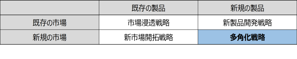多角化戦略は新たな製品を新たな市場で展開するものです。製品と市場のいずれにおいても既存の足場が無い状態で新しい領域に進出する取り組みになります。経営学者アンゾフが提唱した市場マトリックスに基づくと以下の青ハイライトに位置付けられます。