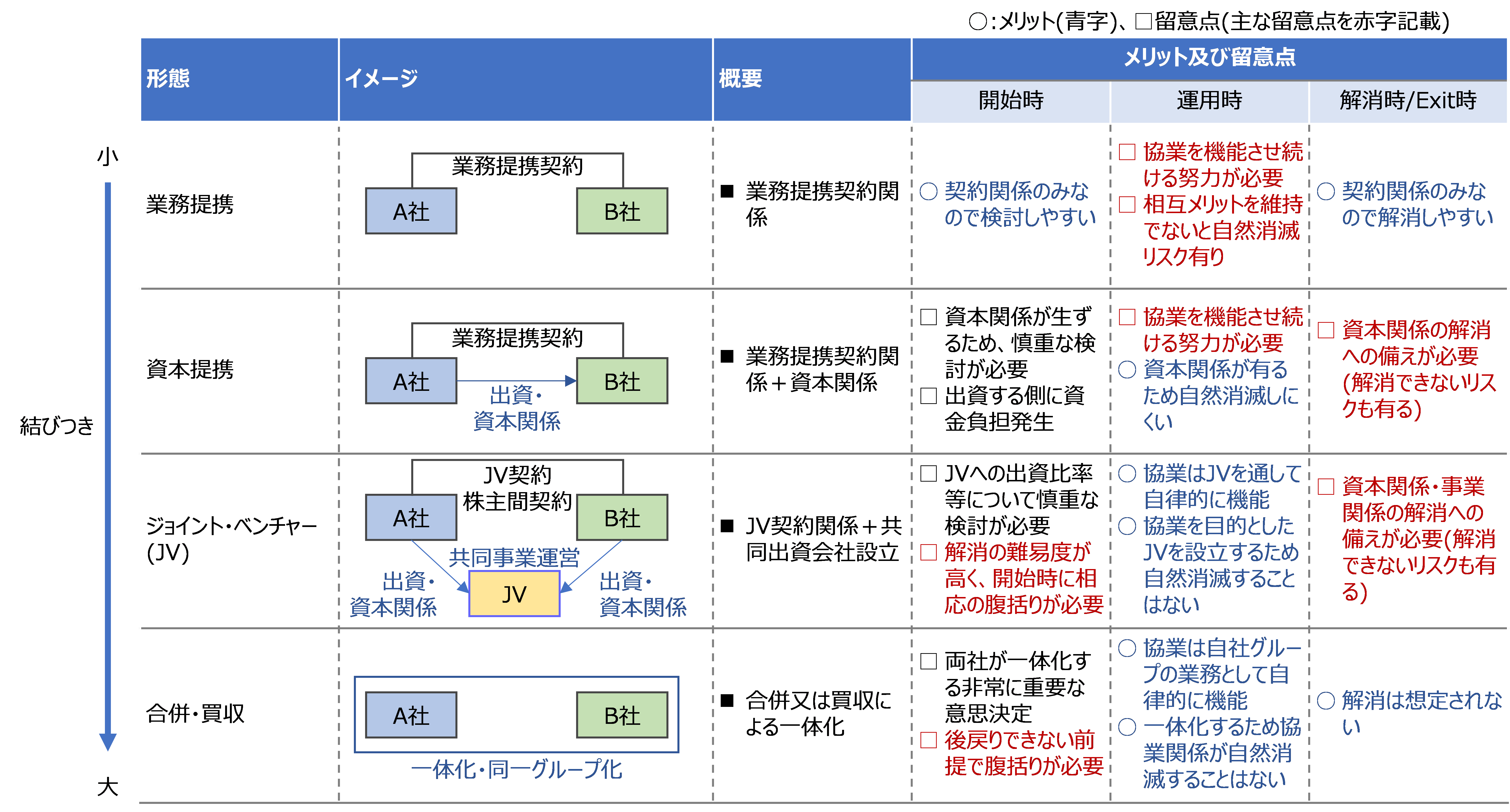相手の有ることであるため何が最適かはケースバイケースですが、どの程度の結びつきで協業を行うべきか、互いにどの程度協業にコミットするかが検討の軸となります。